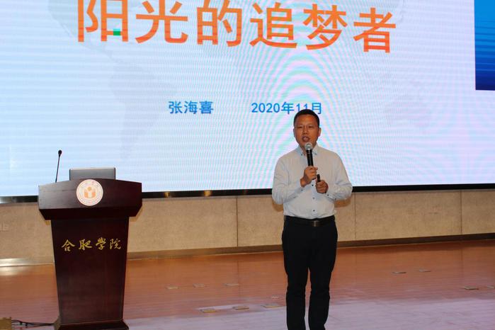 11月12日下午,由大学生创新创业教育中心、能源材料与化工学院和共青团合肥学院委员会共同举办的“校庆校友第二期创业讲座——阳光的追梦者”在图书馆报告厅A厅举行,我校2009届材化学院粉体专业毕业校友张海喜受邀分享创业历程。能源材料与化工学院党委书记童玉松、院长董强参加了创业讲座,讲座由大学生创新创业教育中心主任刘沛平主持。