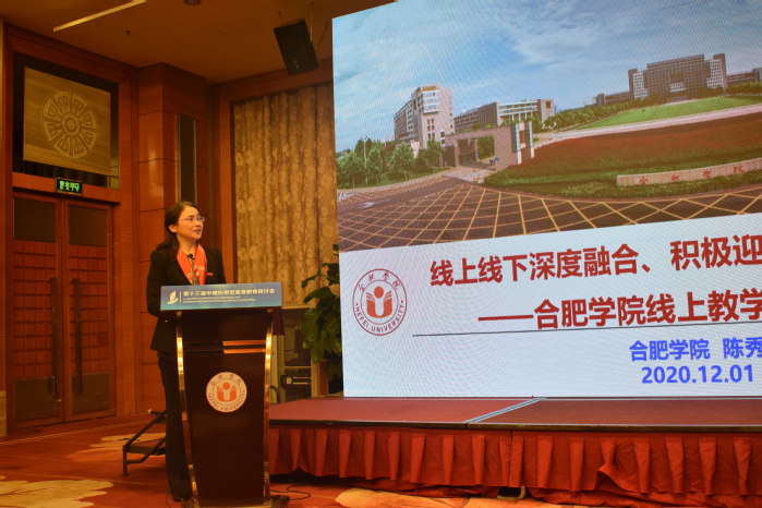 陈秀以《线上线下有机融合、积极迎接“新教育形态”:合肥学院线上教学的实践与探索》为题作报告。她从新时代中国高等教育发展面临新形态、疫情期间合肥学院线上教学实践回顾、未来探索线上线下深度融合的新思路这三个方面作了详细汇报。陈秀提到“金课”和“一流课程”两个关键词,展示了疫情防控背景下在线教育教学的工作思路,总结了疫情期间合肥学院线上教学六大创新做法。