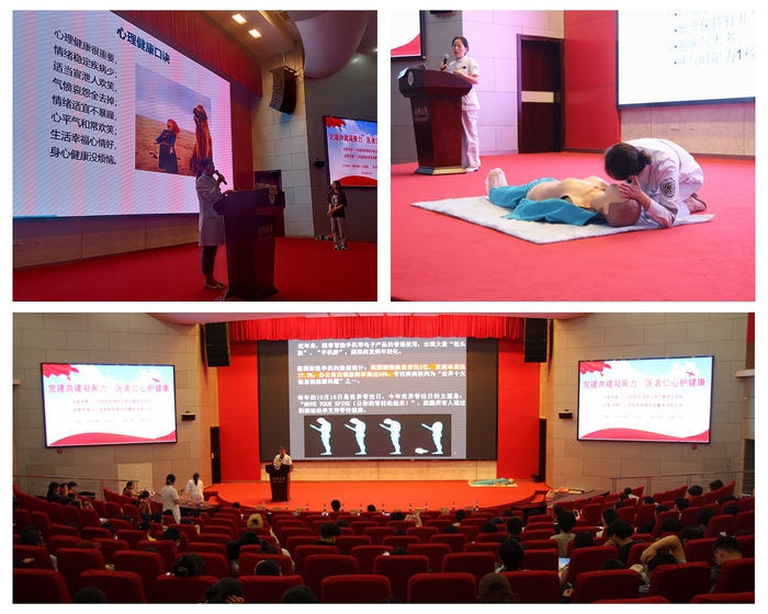 6月6日,学校在图书馆报告厅开展健康科普宣讲活动。合肥市第一人民医院滨湖院区执行院长潘爱红带领专家团队参加活动。脊椎骨科主任杜怡斌介绍了颈椎的结构以及颈椎病的成因、治疗方法和预防措施。心理咨询门诊护士长陈晓菊带领学生学习手指健身操,分享调节情绪的方法。急诊急救护士长刘荆科普心肺复苏急救知识,现场演示模拟心肺复苏的全过程。当天,图书馆一楼大厅还设置了眼科、脊柱骨科、关节骨科、中医科、心理咨询、康复科、消化内科等多个义诊点,为师生提供血压、血糖、视力等多方面的检查及咨询服务。